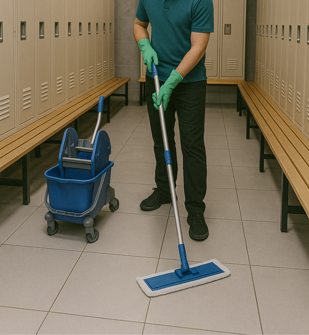Toilets, showers, sinks, lockers, mirrors, and benches are cleaned and disinfected. We also restock essentials like toilet paper and hand soap upon request.