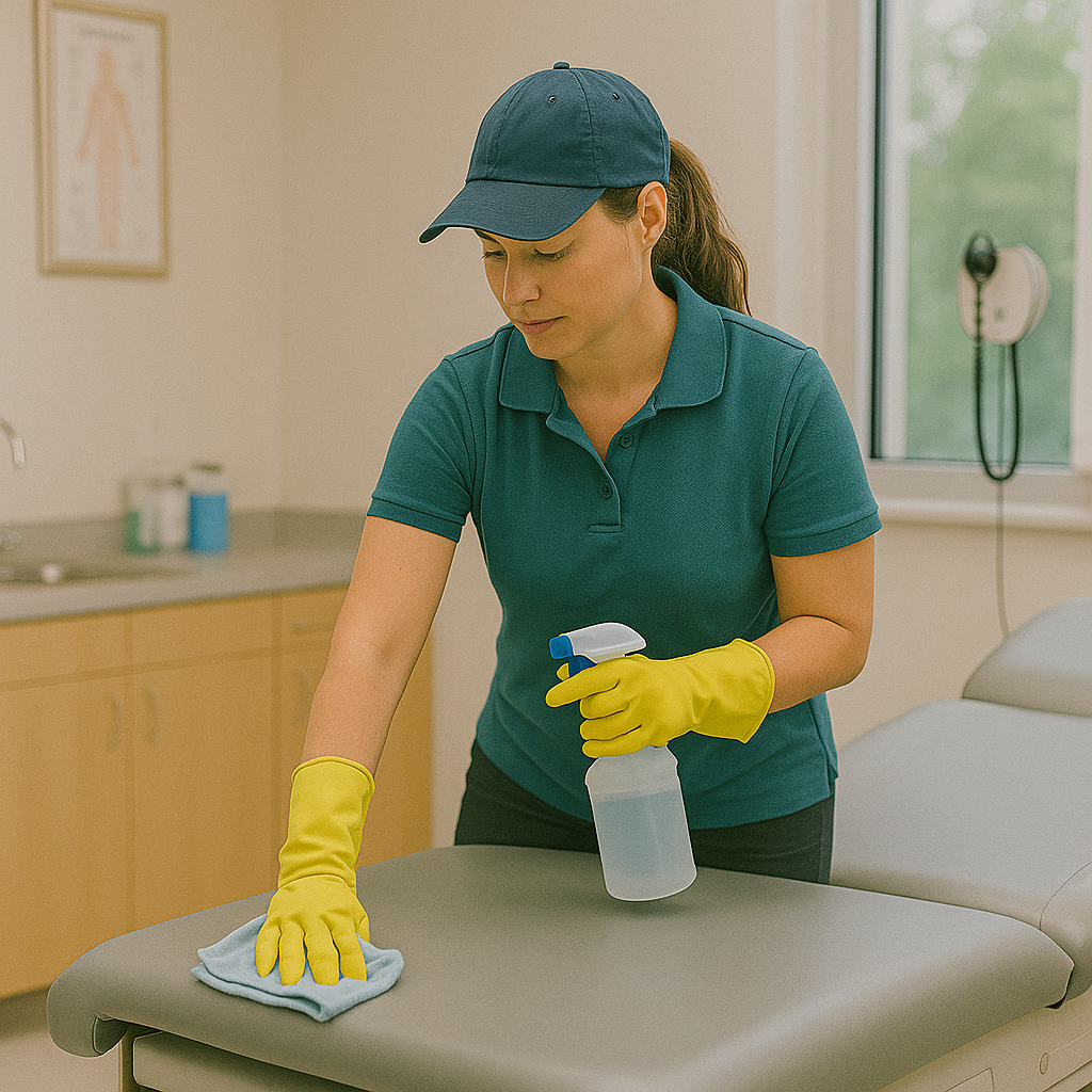 Exam tables, treatment surfaces, and high-contact areas are sanitised with healthcare-safe products to support infection control.